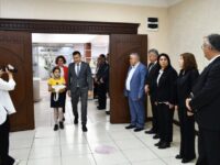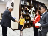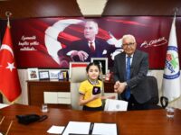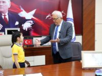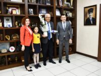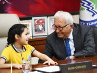 Okul Müdürü Ali Demirbay ve sınıf öğretmeni Esin Çetin ile birlikte başkan yardımcıları tarafından makamda karşılanan Başak Yiğit, Başkan Posbıyık’ı seçim başarısı nedeniyle tebrik etti, çiçek takdiminde bulundu. Koltuğa oturan Yiğit, tüm çocukların Ulusal Egemenlik ve Çocuk Bayramı’nı kutladı.