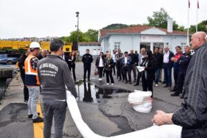 Deniz Kirliliğine Acil Müdahale Tatbikatı gereği, liman içinde oluşan deniz kirliliğine müdahale edildi. Eğitim ve Tatbikat Koordinatörü Çevre Yüksek Mühendisi Mehtap Akbaş tarafından personele kullanılacak malzemeler tanıtıldı, teknik bilgiler aktarıldı.