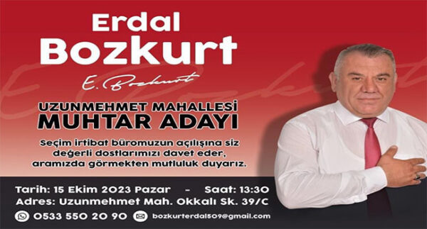Uzunmehmet Mahallesi Muhtar Adayı Erdal Bozkurt, Uzunmehmet Mahallesi Okkalı Sokak No:39/C adresinde, 15 Ekim Pazar günü ve saat 130:30’da yapılacak olan seçim irtibat bürosu açılışına mahalle sakinleri ve tüm dostlarını davet ediyor.