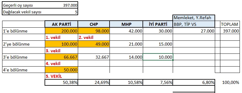 Varsayalım ki iddiada yer almayan MHP ve İYİ Parti 2018 seçimlerinde aldıkları oyu ancak alabilsinler. Yani MHP 42.000 İYİ Parti de 30.000 oy almış olsun tekrar. Toplamı 72 bin eder. Kalan miktar nedir? 298.000. Bu oy miktarına göre AK Parti’nin 4 milletvekili çıkarması için gereken en düşük oy miktarı 200.000. CHP’ ye kalan oy miktarı da 98.000