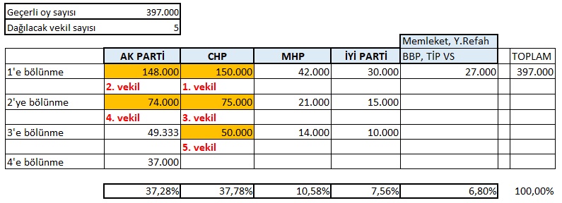 Bakalım bunun için nasıl bir rakam gerekiyor. İddiada adı geçen partilerin haricindeki oyları, yine geçen seçimde aldıkları oy miktarı olarak kabul edelim. Çıkan sonuca göre, CHP ve AK Parti için kalan oy miktarı 298.000. Burada da CHP’ nin 3 vekili alması için gereken oy miktarı minimum 150.000 ve AK Parti’nin de alacağı oy miktarı maksimum 148.000 olması gerekiyor. Bu durum için tablo şöyle oluşuyor.