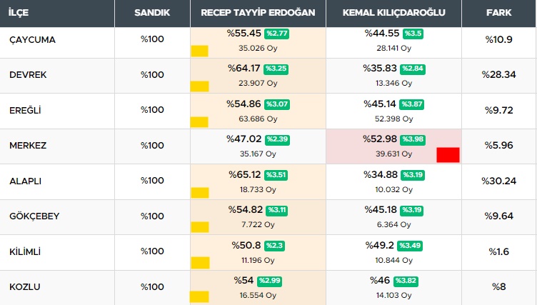 İlçeler bazında bakıldığında Zonguldak merkezi Kılıçdaroğlu önde tamamlarken diğer 7 ilçenin hepsinde Erdoğan önde tamamladı.